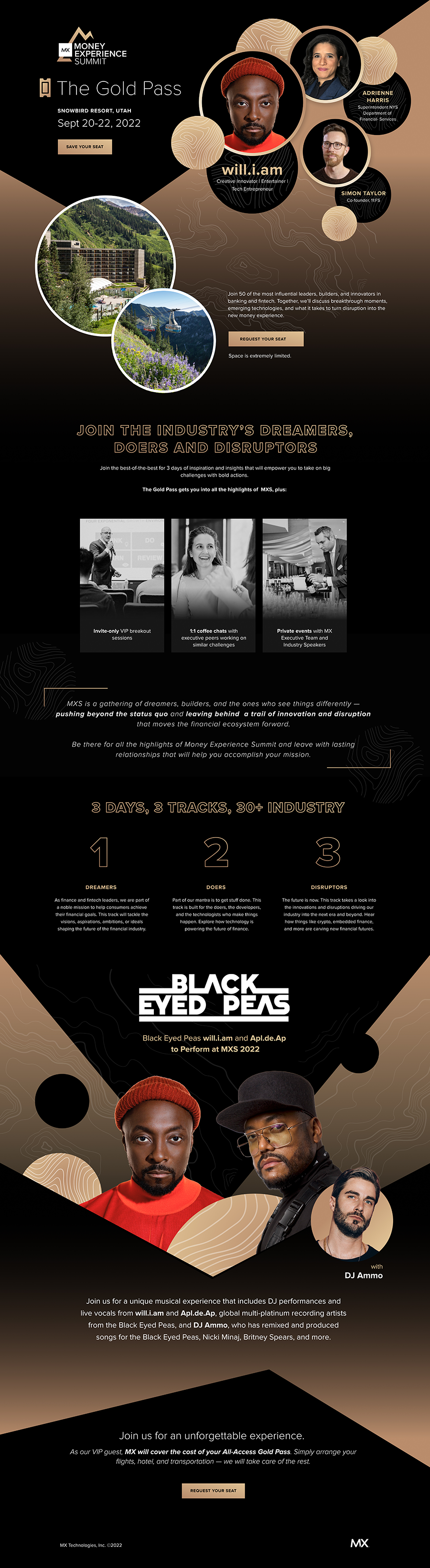 MX Money Experience Summit (MXS) Hosted annually at Utah’s Snowbird Resort, the Money Experience Summit is an invite-only gathering of financial and fintech leaders. The event brings together visionary speakers, forward-thinking conversations, collaborative workshops, and high-level executive networking focused on the future of money and digital experiences. The top-tier “Gold Pass” offered an elevated, more personalized experience with exclusive access and premium programming for senior leaders.