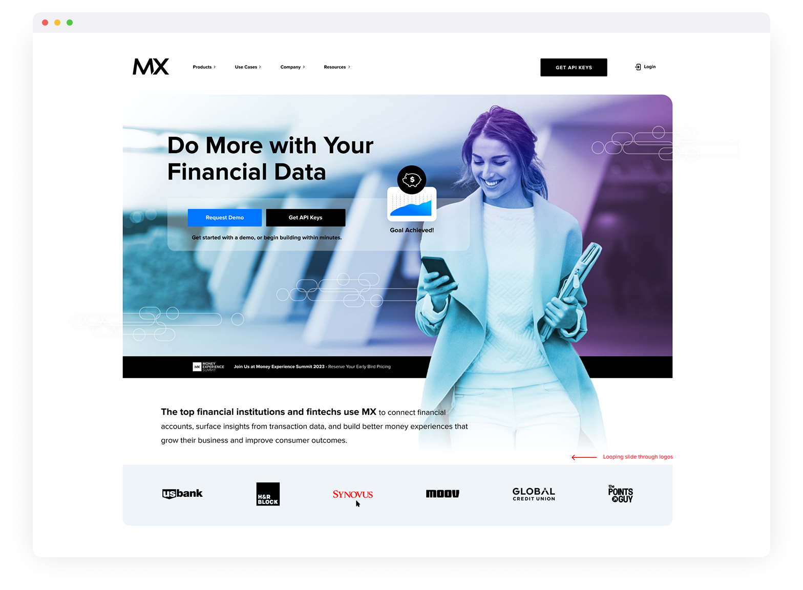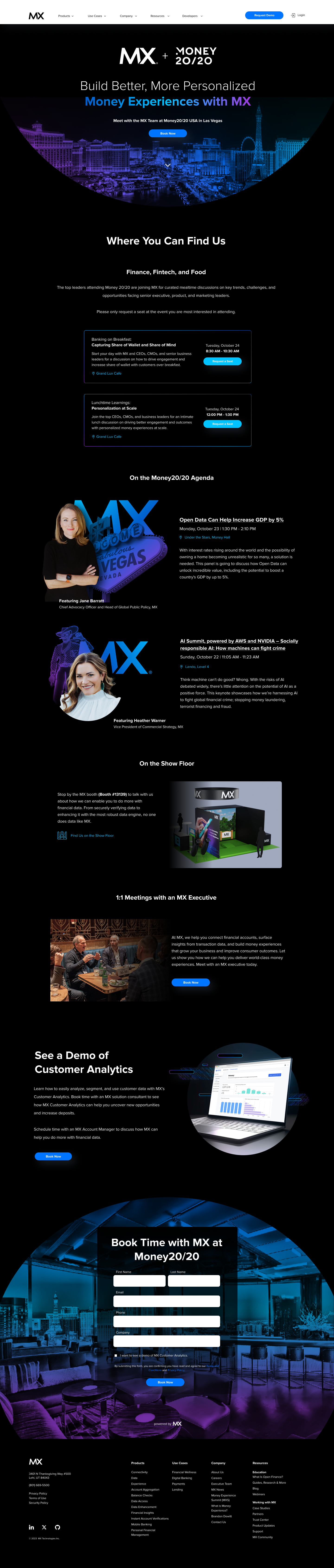 From a design and UX perspective, the challenge was prioritization. The page needed to serve diverse audiences - prospects, partners, and industry leaders - without overwhelming them. My approach focused on strong content hierarchy and clarity, allowing users to quickly understand why MX mattered at Money20/20, where to find the brand on-site, and how to engage at a level relevant to them.