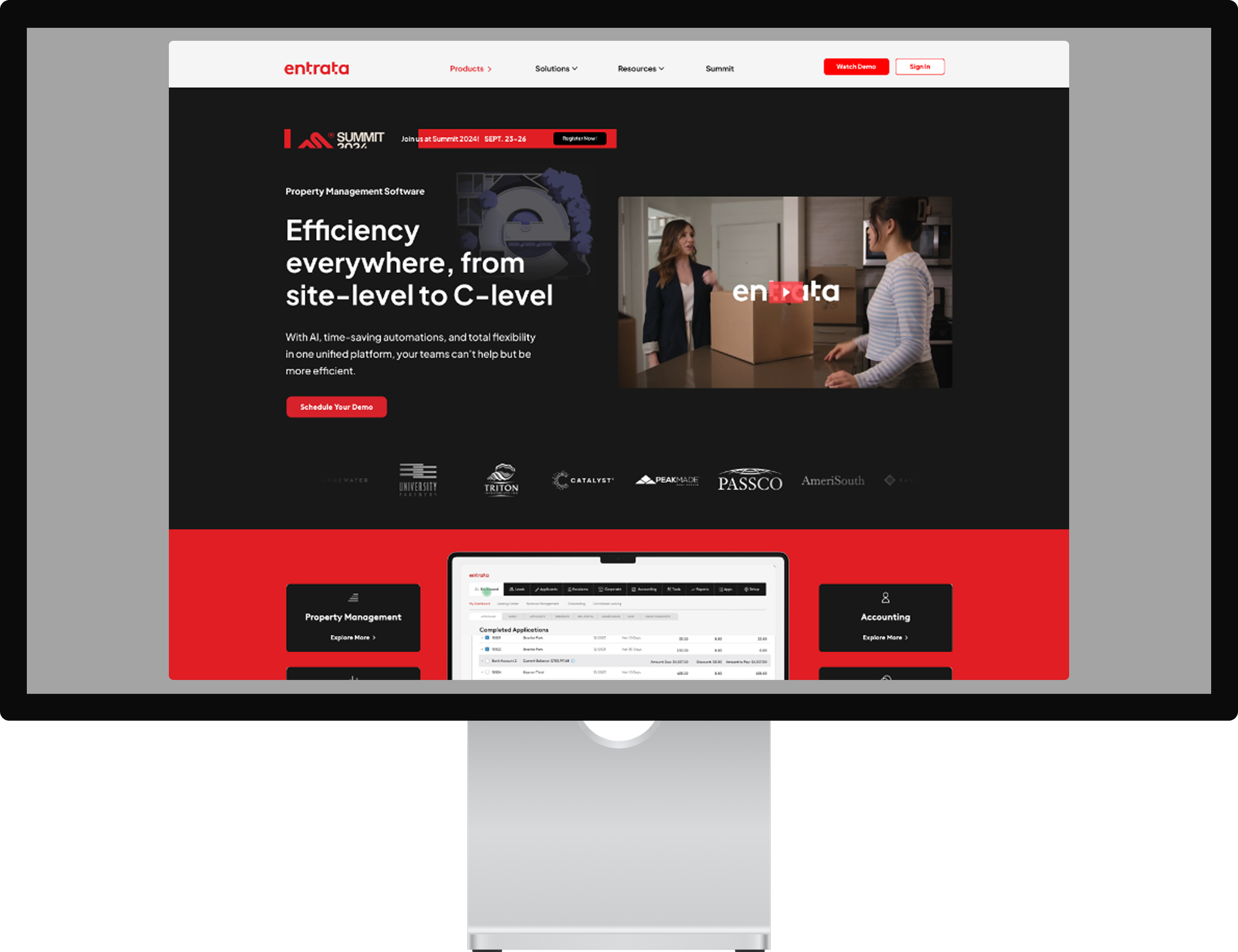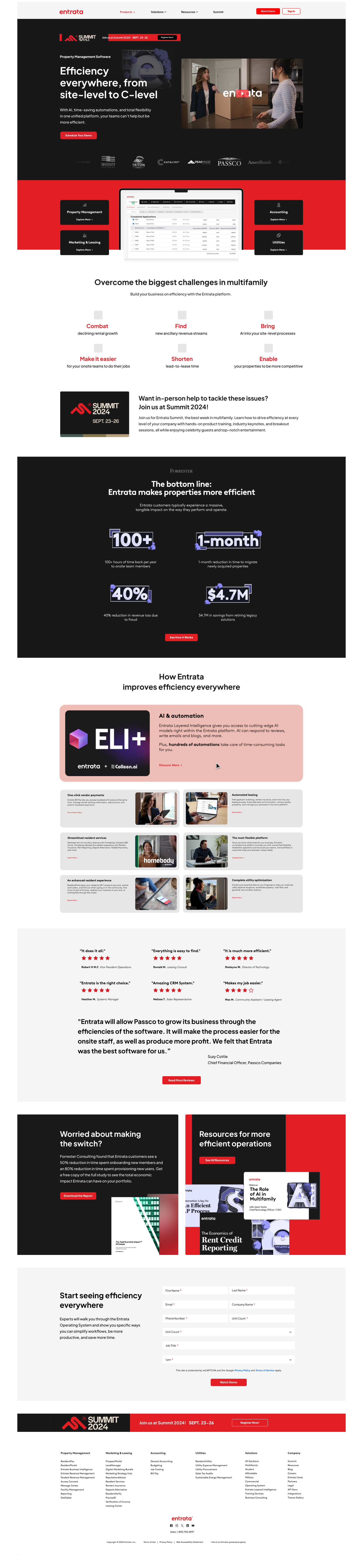 The challenge was scale and clarity. Entrata’s offering spans multiple products, audiences, and use cases, requiring a user experience that felt intuitive, cohesive, and approachable while still reflecting the company’s enterprise-level credibility. My approach focused on translating Entrata’s brand into a clean, confident UI system-using strong hierarchy, simplified navigation, and purposeful visual storytelling to guide users through complex information with ease.