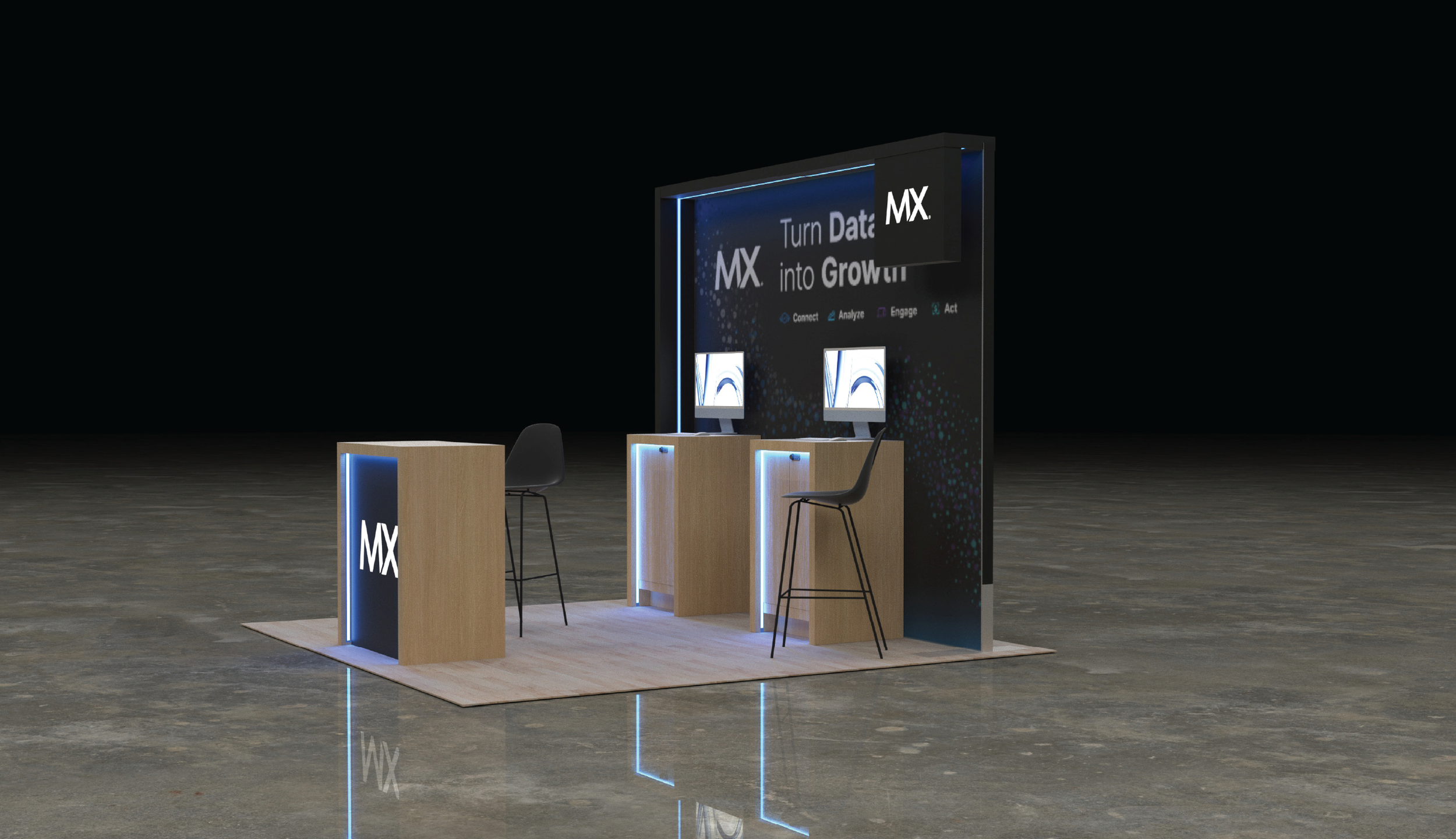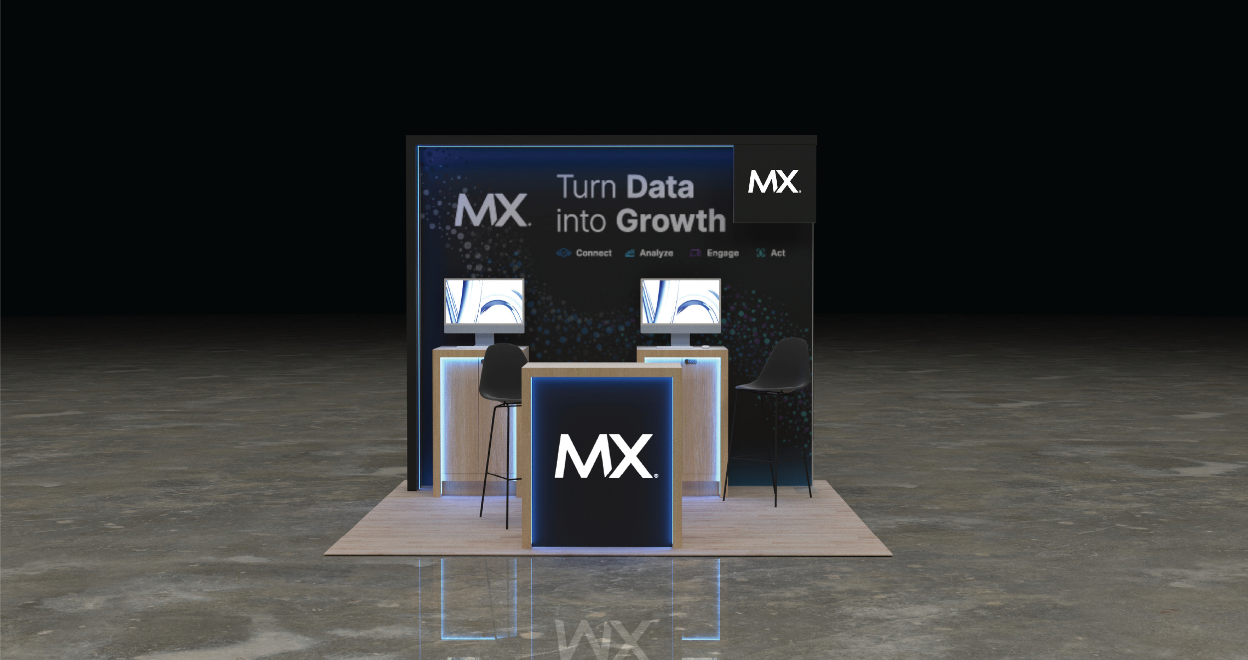 From a design perspective, flexibility was critical. The modular system allowed MX to maintain a consistent brand experience across events of varying sizes while maximizing ROI on a single build. Clear sightlines, strong visual hierarchy, and bold brand moments ensured the booth was recognizable from a distance and immediately legible up close - regardless of footprint.
